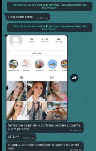 Como suele ocurrir en estos casos, una vez que se adueñan de la cuenta, los bichos contactan de alguna manera a la persona para pedirle dinero por devolver lo que no les pertenece.