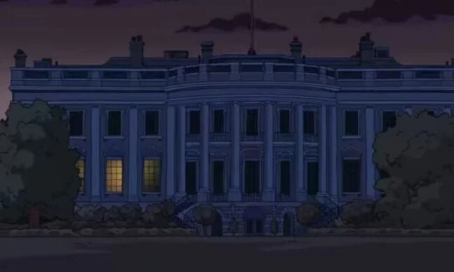 En una de las secuencias aparece la Casa Blanca, la cual es presentada con las luces apagadas, como sucedió este domingo, pero en la serie de la familia amarilla el apagón se debe a una tormenta eléctrica.