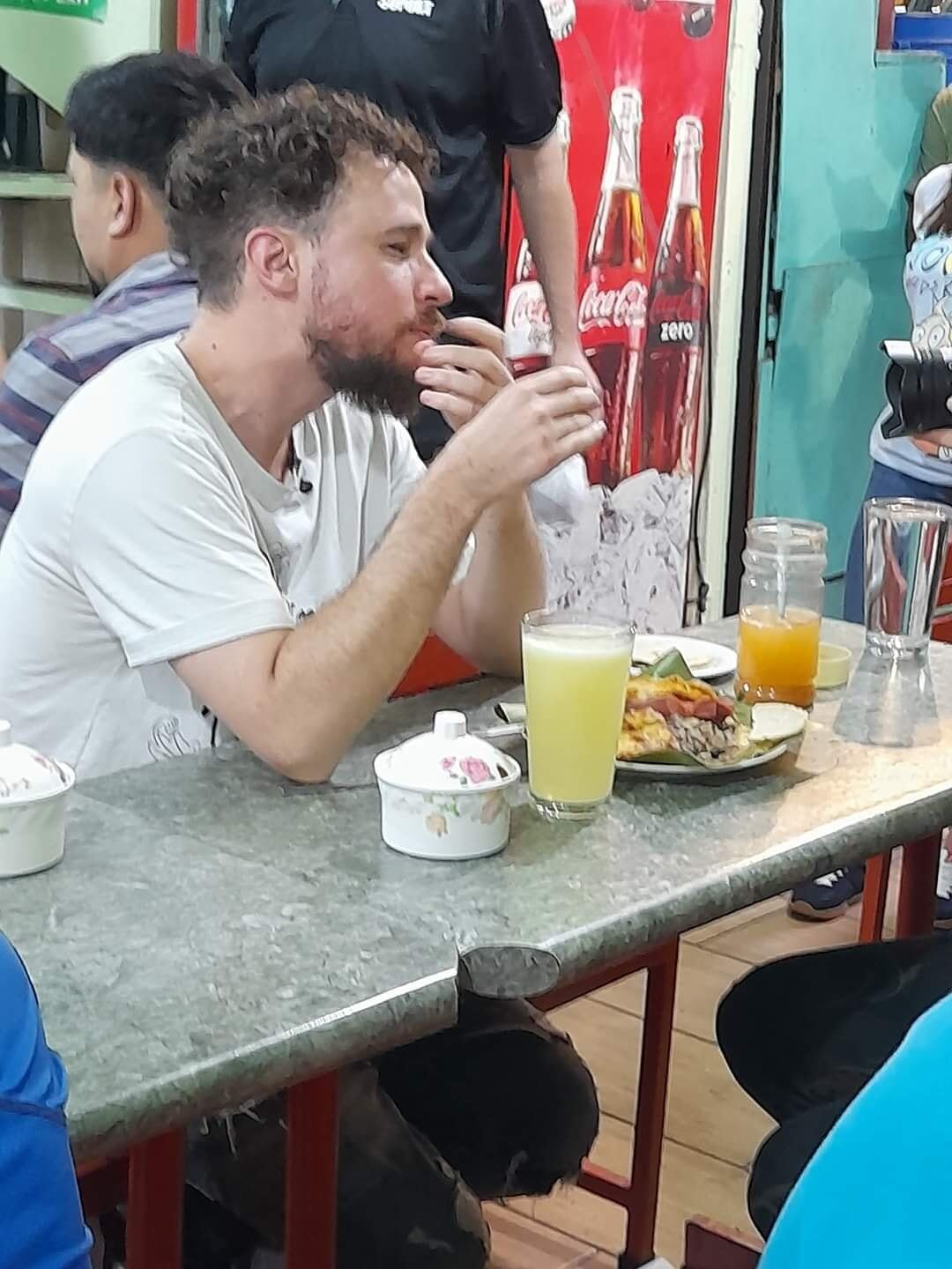 En su primer día en Costa Rica, el mexicano se fue para el puro centro de Chepe y aceptó la recomendación que le hicieron de probar el delicioso pinto que sirven en una hoja de plátano, cargado de sabor pero sobre todo de amor, según la administradora Blanca Alfaro.