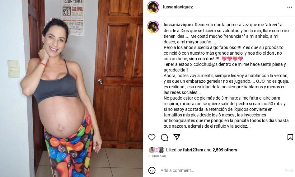 “Y si no estoy acostada, la retención de líquidos convierte en tamalitos mis pies desde los tres meses, las inyecciones anticoagulantes que me pongo en la pancita todos los días hasta que nazcan, además del reflujo y la acidez…”, compartió Lussania.