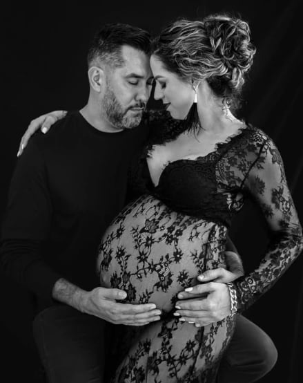 La imagen es un retrato en blanco y negro de Lu, Jorge y los bebitos en la pancita de la mamita que derrite de la ternura.