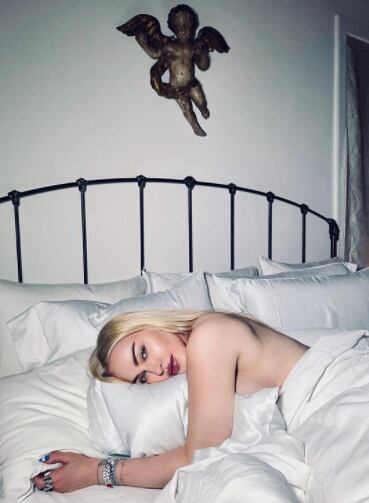 En lencería y semidesnuda, la cantante posó en una habitación custodiada por una figura de un ángel colgado en la pared.