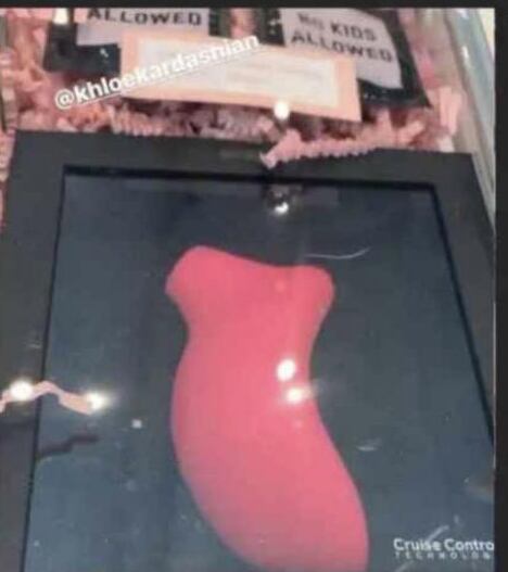 Khloe fue muy original, ya que en cada artículo escribió frases, en el vodka: “para la mamá de las cinco en punto”. En los condones: "no se permiten niños”. En la pluma de vapor de marihuana: “para el estrés mami”. Pero la sorpresa llegó cuando encontró el juguete sexual. También le entregó un bolso de mano Dior y un ramo de flores.