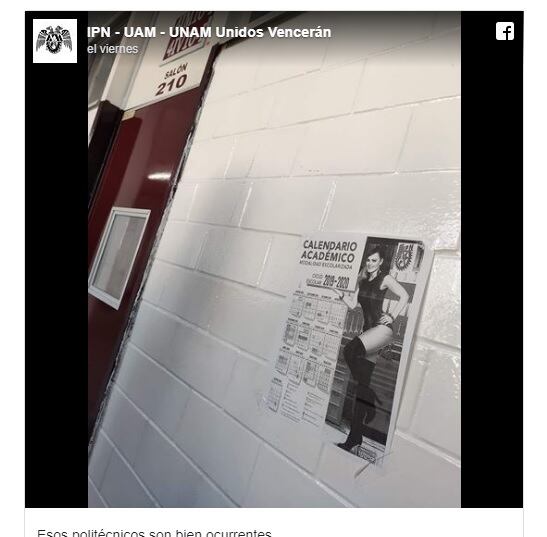 En la cuenta de Facebook llamada IPN-UAM-UNAM Unidos Vencerán comenzó a circular una imagen donde se ve un almanaque académico del ciclo 2019-2020 pegado en las afueras de un salón de clases, con una fotografía de cuerpo completo de la tica.