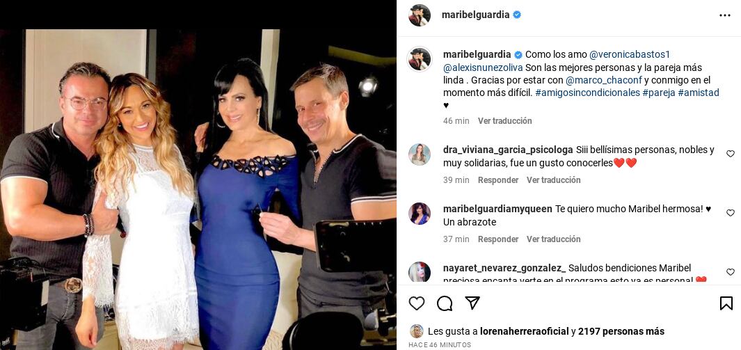 “¡Cómo los amo Verónica Bastos y Alexis Núñez! Son las mejores personas y la pareja más linda. Gracias por estar con Marco (Chacón, esposo de Maribel) y conmigo en el momento más difícil”, escribió Maribel en sus redes sociales.