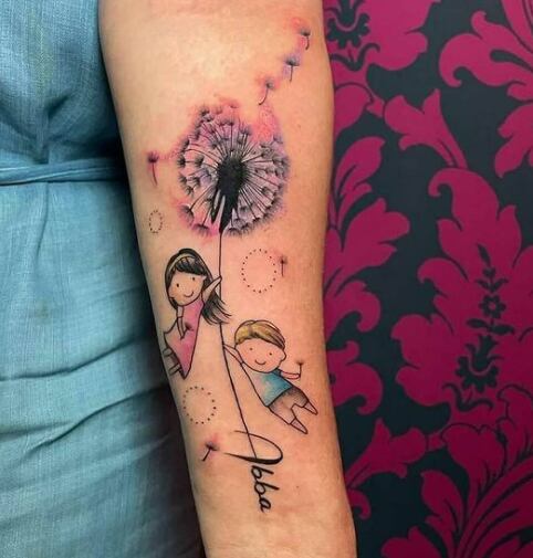 Se trata de un diente de león, con una niña y un niño, que son sus hijos Marie Claire y Eric, y la palabra Abba (padre en arameo, idioma en que está escrita parte de la Biblia).