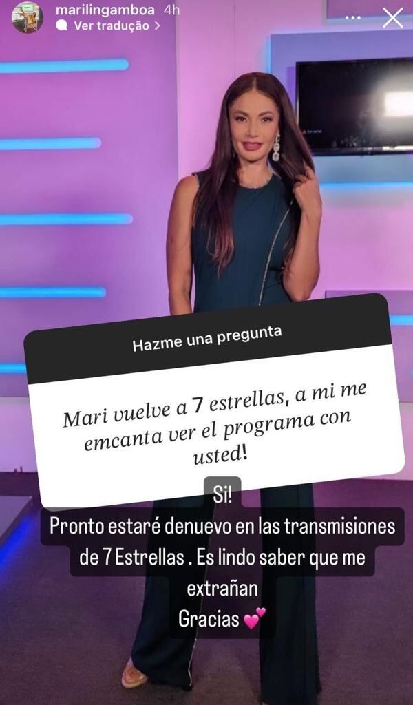 “¡Sí! Pronto estaré de nuevo en las transmisiones de 7 Estrellas. Es lindo saber que me extrañan. Gracias”, afirmó ella tras recibir ese mensaje.