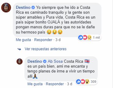 “Me da mucha lástima porque Costa Rica es un país muy seguro, pura vida y lleno de energía positiva. Me encanta Costa Rica. Mi gente de Costa Rica, cuiden su país que todavía ustedes tienen un país virgen y bueno, en comparación con muchos países de Latinoamérica. He visto algunos caos y este no es el Costa Rica que yo conozco, que yo voy, que ando por las calles”, contó.