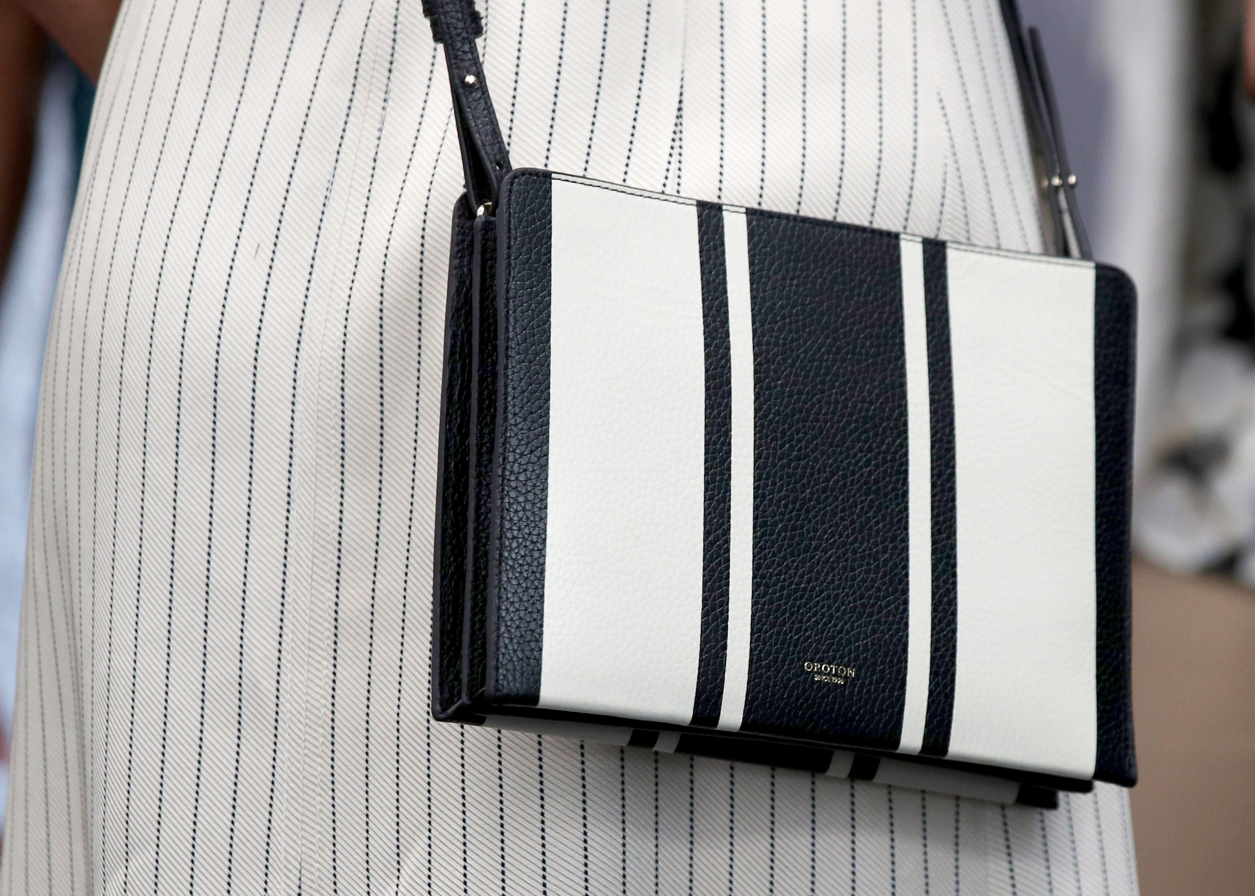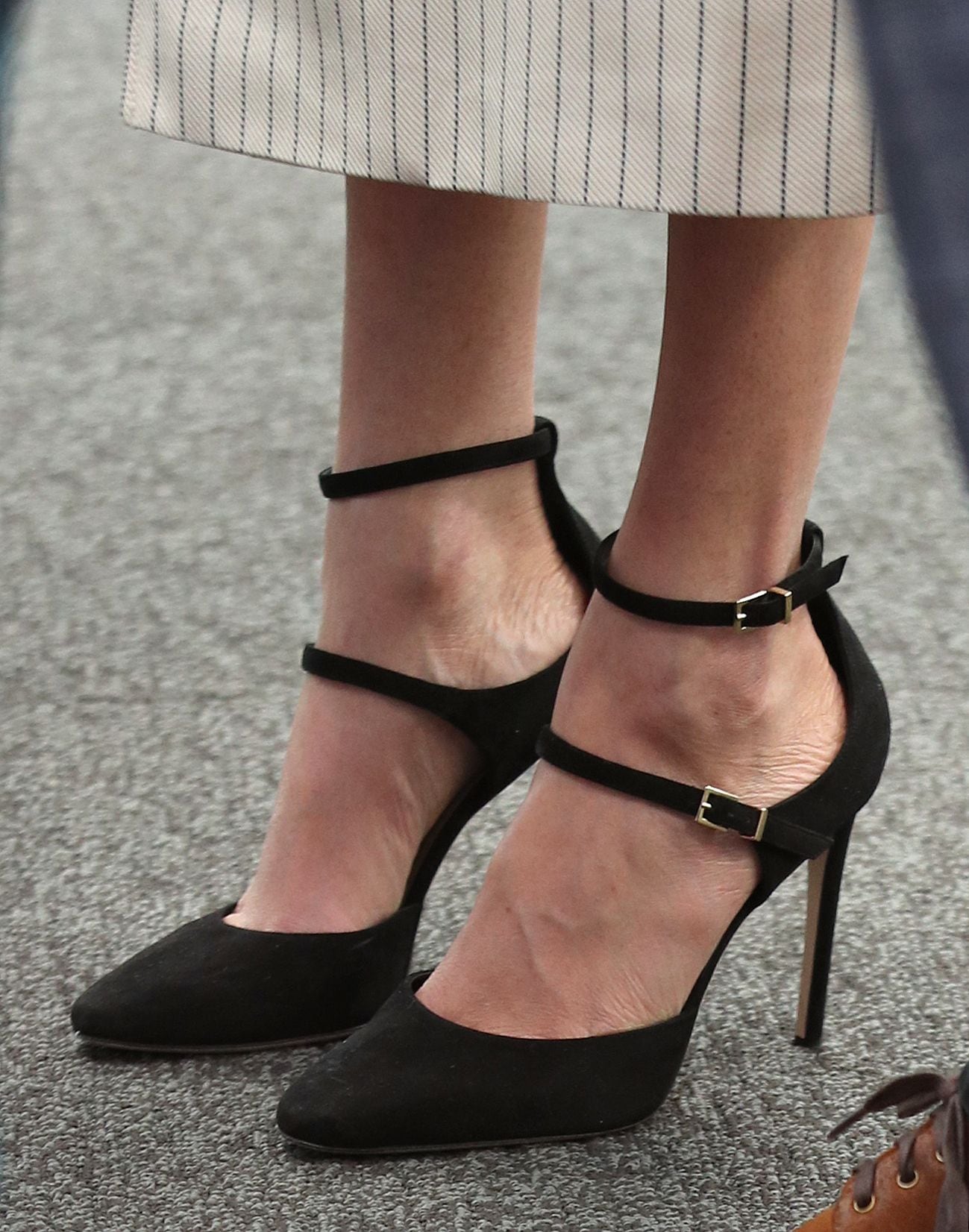 Para combinar su look, Meghan eligió unos zapatos negros con dos tiras en el empeine de la marca Tamara Mellon, de 383 euros (¢270 mil), y un bolso también de una firma australiana, en este caso Oroton, de 207 euros (¢140 mil). Se trata de una cartera de mano que la actriz llevaba como bandolera realizada con piel dibujando rayas en blanco y azul marino.