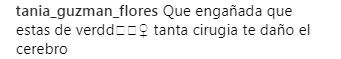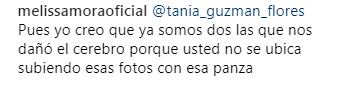 Tania_guzman_flores comentó “Que engañada que estás, de verdad que tanta cirugía te daño el cerebro”, a lo que Mora respondió “Pues yo creo que ya somos dos a las que se nos dañó el cerebro porque usted no se ubica subiendo esas fotos con esa panza”.