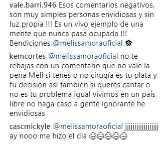 Una de las que se sintió más ofendidas por tanta crítica fue la modelo y colega de Mora Karina Porras, quien afirmó que, si a la gente no le gustaba la música de Meli, pueden ir a ver contenido a otras cuentas de Instagram.