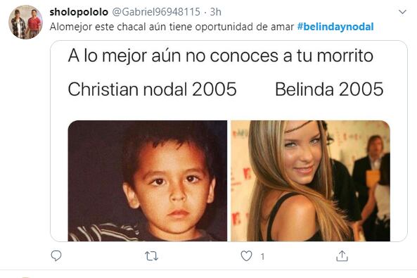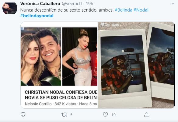 Además, las mujeres publicaron que no hay que dejar de creer en ese “sexto” sentido, pues días atrás Nodal, de 21 años, confirmó que su exnovia María Fernanda Guzmán estaba celosa de que le tocara trabajar al lado de Belinda, de 30 años.