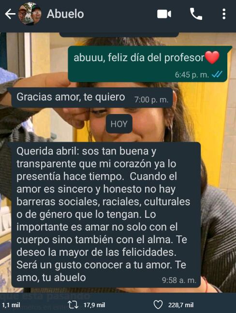 “Querida Abril: sos tan buena y transparente que mi corazón ya lo presentía hace tiempo. Cuando el amor es sincero y honesto no hay barreras sociales, raciales, culturales o de género que lo tengan. Lo importante es amar no solo con el cuerpo, sino también con el alma. Te deseo la mayor de las felicidades. Será un gusto conocer a tu nuevo amor. Te amo, tu abuelo”, dice el mensaje.