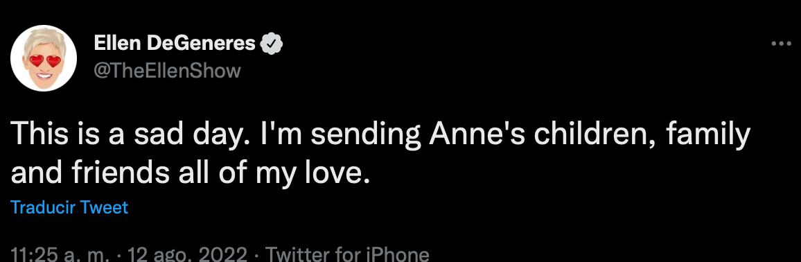 DeGeneres se manifestó en sus redes diciendo que “hoy es un día triste. Envío todo mi amor a los hijos de Anne, a su familia y amigos”.
