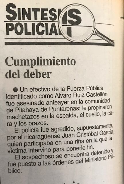 El 16 de marzo de 1997 es inolvidable para la familia del recordado oficial y para todo el pueblo de La Pitahaya de Puntarenas. Ese día, un nicaragüense acabó a machetazos con la vida del uniformado.