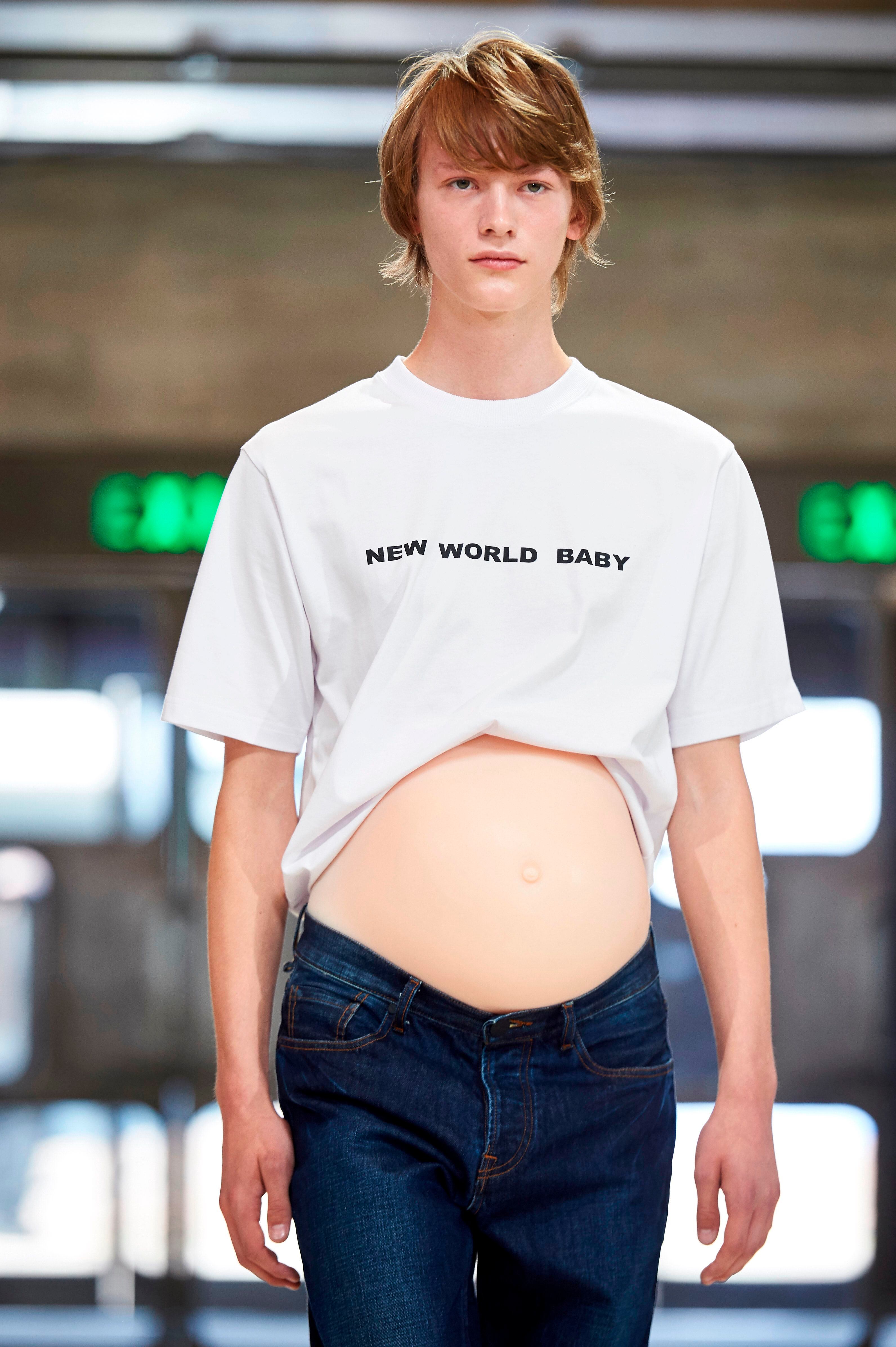 La colección del diseñador chino Xander Zhou incluyó un modelo masculino con una falsa barriga de embarazado, vistiendo jeans y una camiseta que decía “New World Baby” (Bebé del nuevo mundo).