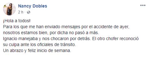 La presentadora de televisión Nancy Dobles y su pareja, el director de Telenoticias, Ignacio Santos, se pegaron tremendo susto este domingo, luego de que se vieran involucrados en un accidente de tránsito en La Sabana.