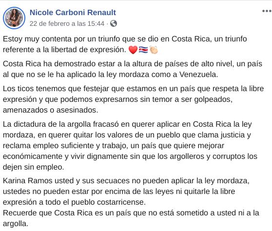 Entonces Carboni hizo uso de sus redes sociales el sábado anterior para referirse al fallo. "Estoy muy contenta por un triunfo que se dio en Costa Rica, un triunfo referente a la libertad de expresión”.