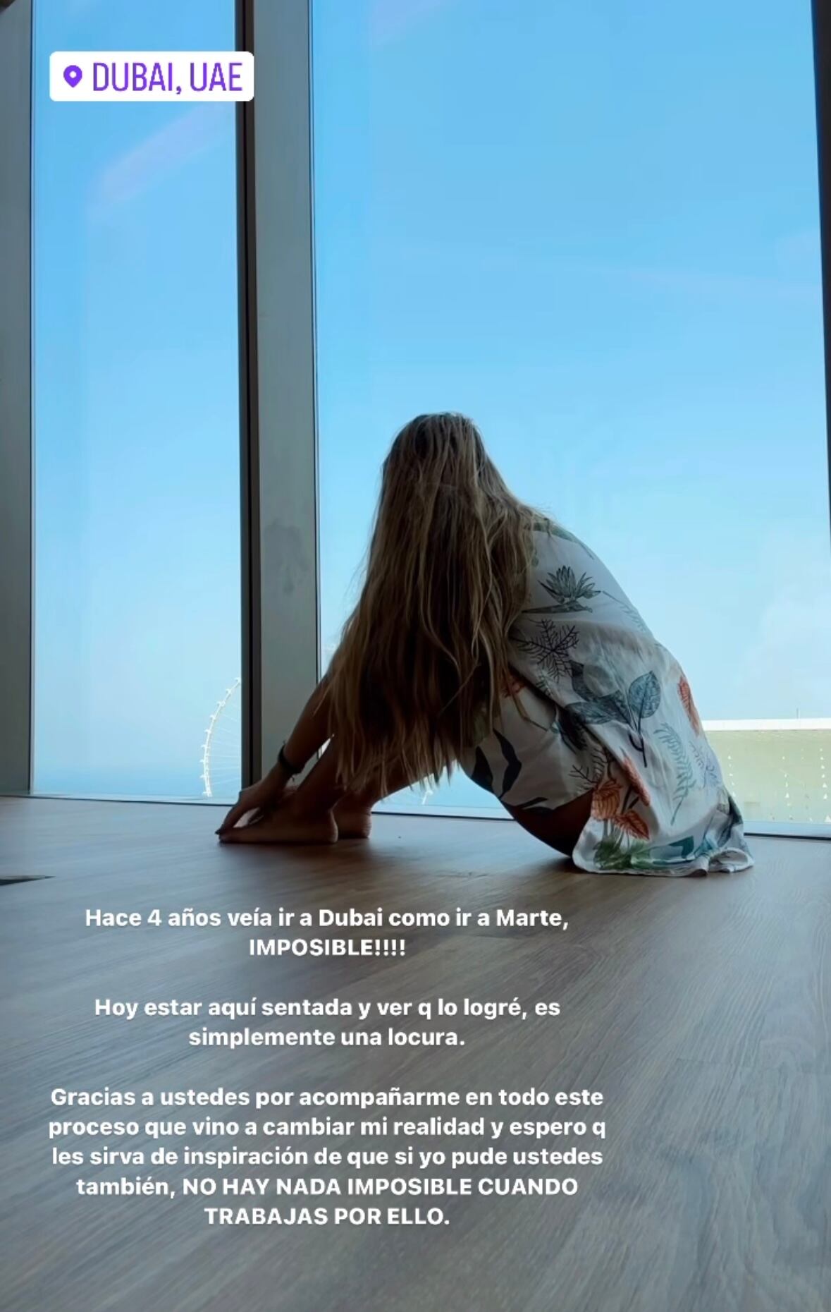 La curvilínea además subió un video de ella y escribió: “Hace cuatro años veía ir a Dubái como ir a Marte, imposible. Hoy estar aquí sentada y ver que lo logré, es simplemente una locura. Gracias a ustedes por acompañarme en todo este proceso que vino a cambiar mi realidad y espero que sirva de inspiración porque si yo pude, ustedes también. No hay nada imposible cuando trabajas por ello”.