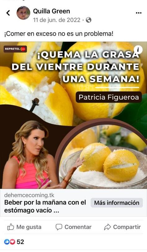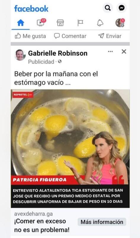 “Hace tiempo atrás me había pasado algo con lo de las criptomonedas o algo así, pero digamos que duró como dos meses circulando en redes. Usaron la imagen de Pablo Wanchope y de unas cuantas figuras públicas, pero eso pasó y ya. Pero esto tiene ya seis meses y no hay manera de que pare. Además, cuando se trata de un producto de bajar de peso lastimosamente impacta a todo el mundo porque la gente que anhela bajar de peso lo intenta con cualquier cosa”, dijo algo indignada.