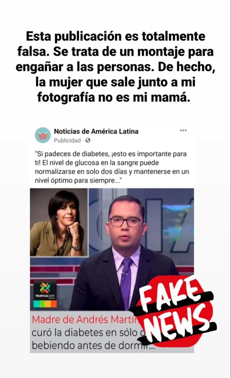Resulta que al comunicador le hicieron dos montajes donde supuestamente unos estafadores tratan de venderle pastillas “milagrosas” a las personas para diabetes y otras enfermedades. Martínez mediante sus redes compartió una serie de fotografías, donde afirmó que las fotos compartidas eran totalmente falsas.