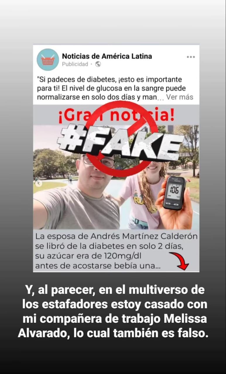 En una de las fotos falsas agregaron que la esposa del periodista era Melissa Alvarado, la cual se libró de la diabetes en dos días, así como un montaje donde sale su supuesta mamá la cual también pudo salir de esta enfermedad.