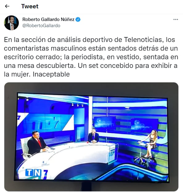 “En la sección de análisis deportivo de Telenoticias, los comentaristas masculinos están sentados detrás de un escritorio cerrado; la periodista, en vestido, sentada en una mesa descubierta. Un set concebido para exhibir a la mujer. Inaceptable”, publicó en su Twitter el politólogo.