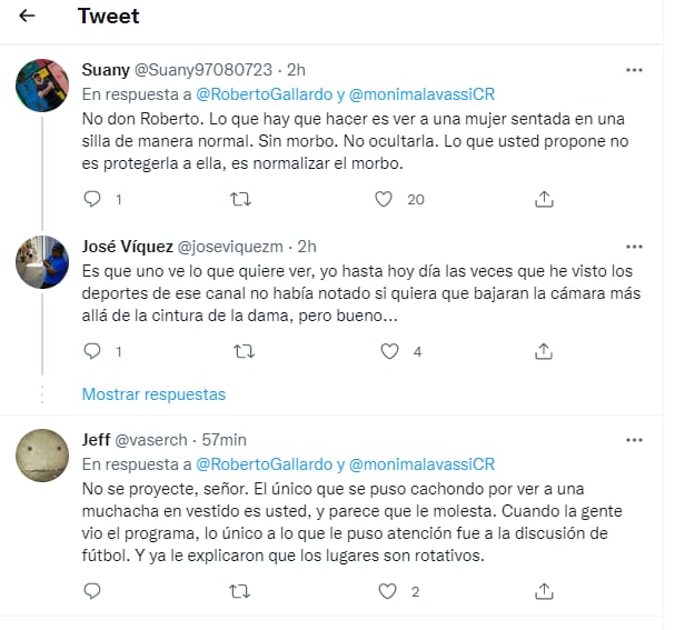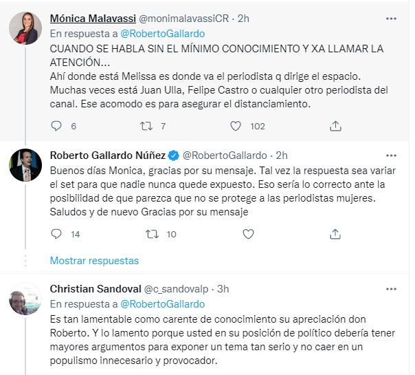 Otra que sacó los tacos de frente para defender a Alvarado fue la comentarista deportiva Mónica Malavassi, quien le respondió el tuit a Gallarado escribiéndole: “Cuando se habla sin el mínimo conocimiento y por llamar la atención... Ahí donde está Melissa es donde va el periodista que dirige el espacio. Muchas veces está Juan Ulloa, Felipe Castro o cualquier otro periodista del canal. Ese acomodo es para asegurar el distanciamiento”.