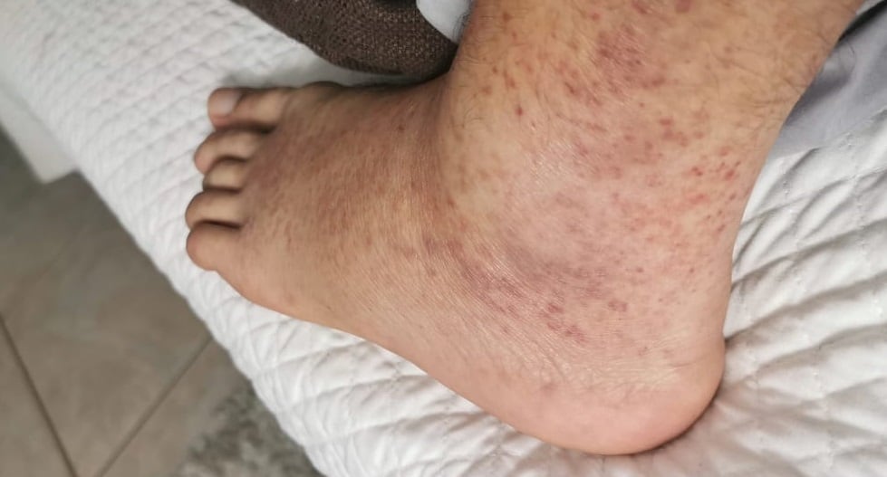 El pie empezó solo inflamado y el miércoles el doctor de Sarchí me dijo que sí es una trombosis y que mejor me fuera para el San Juan de Dios, que es donde me toca porque yo vivo en San José por el trabajo, y me hicieron otro ultrasonido y me dieron otros antibióticos, pero ya a partir de ese día se me empezó a hacer una alergia en los dos pies, yo me empecé a asustar un montón. Era como cuando a uno lo pica una hormiga y la roncha se hace roja y el pie se me empezó a poner más morado.