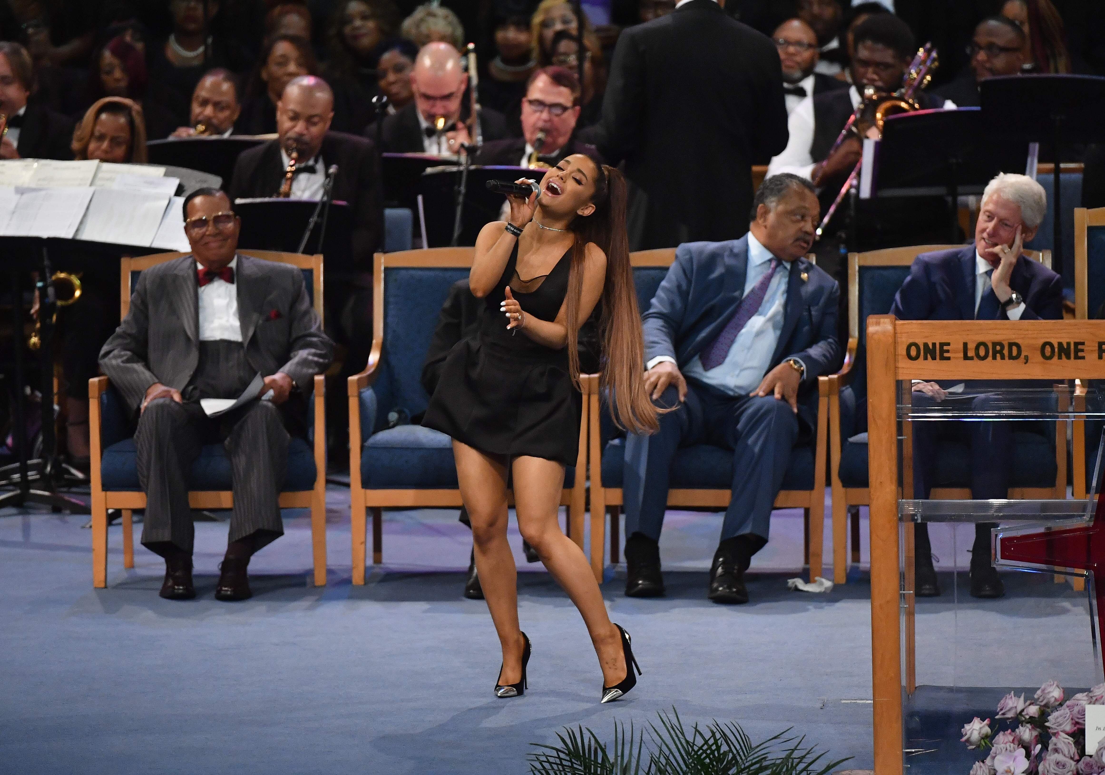 Ariana Grande interpretó un clásico de Aretha Franklin en el funeral de la Reina del Soul con un vestido negro tan cortito que sacudió las redes sociales de inmediato.