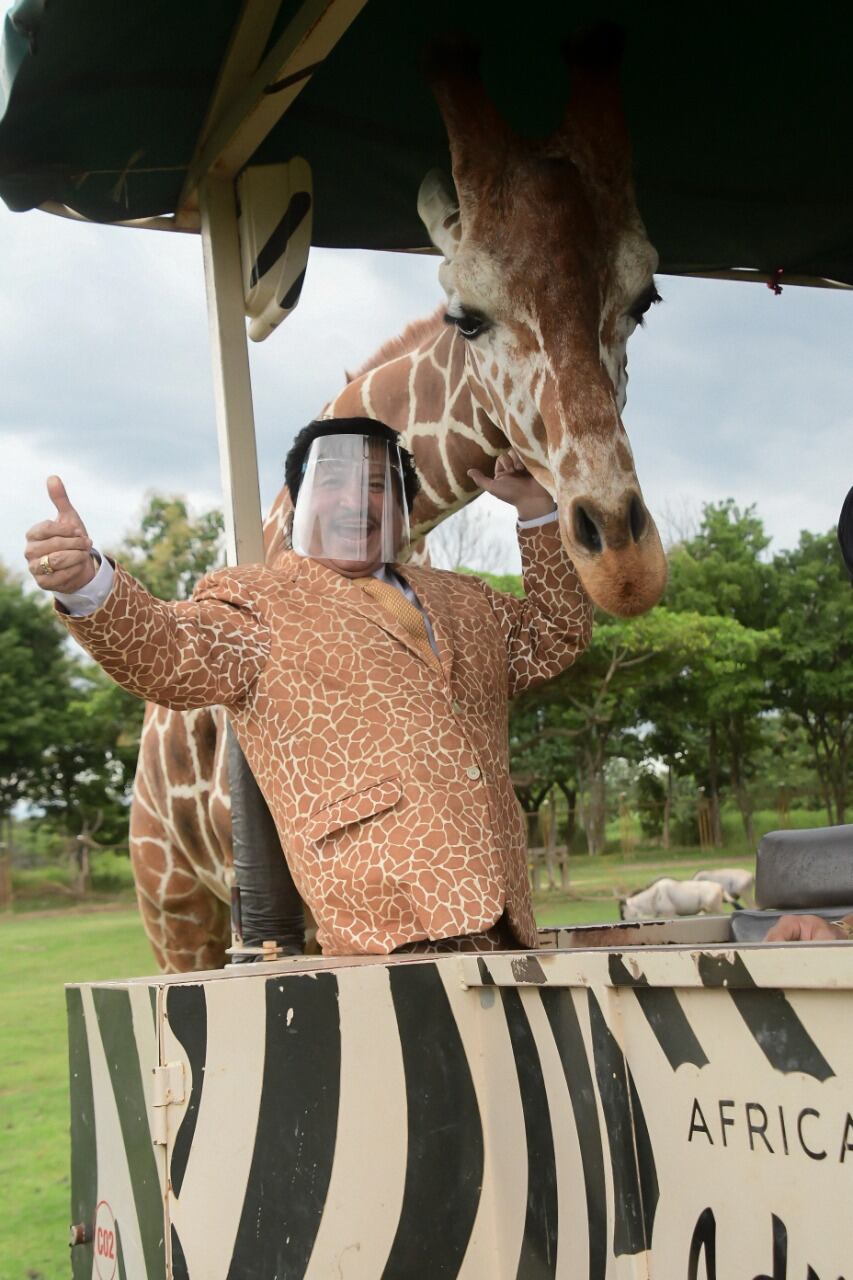 Como es tan detallista, el Porcio eligió para la visita el traje que le pareció más apropiado: uno que imita la piel de las llamativas jirafitas y sin duda que se anotó un diez en estar a la moda.