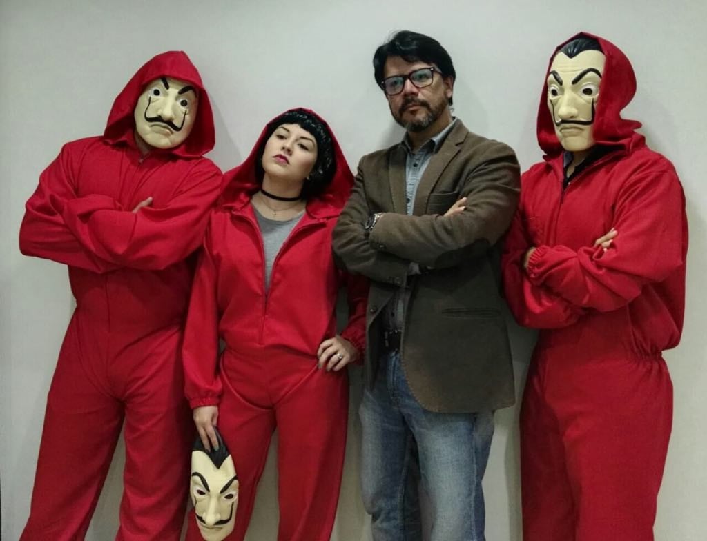 Para hacer la cosa aún más similar a la serie, se mandaron a hacer los mismos trajes rojos y hasta lograron conseguir, en un local de Desamparados, las máscaras de Salvador Dalí, que usan los atracadores de la fábrica.