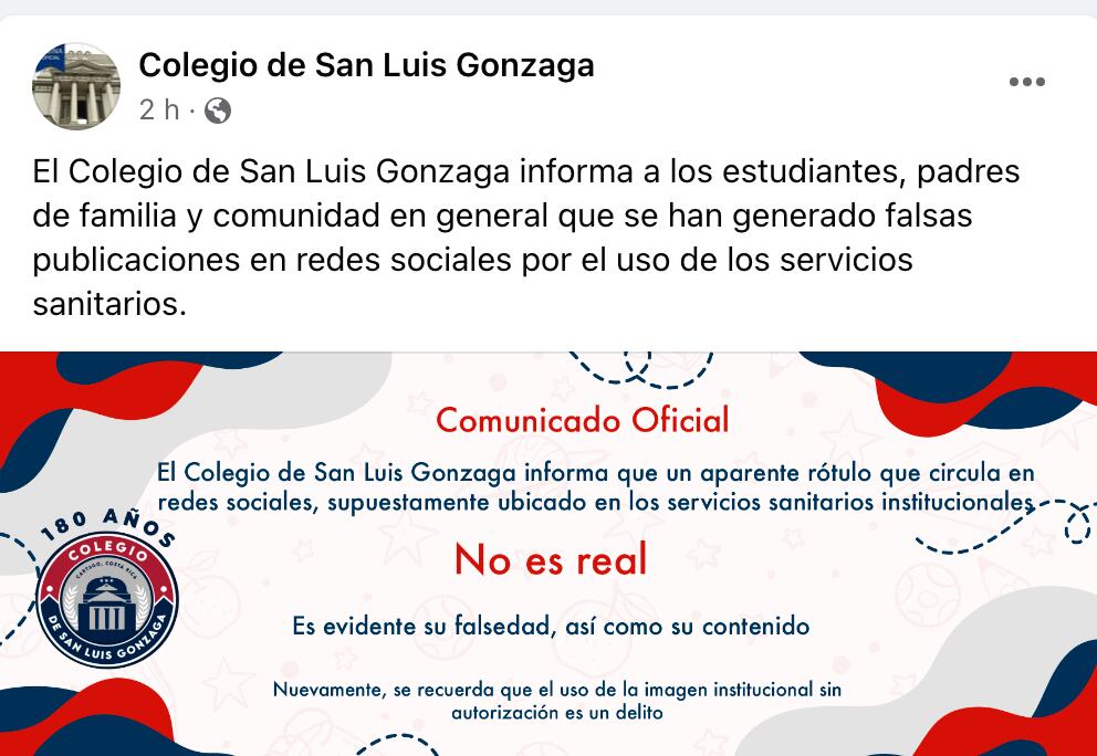 La entidad educativa fue contundente y afirmó que “El Colegio de San Luis Gonzaga informa a los estudiantes, padres de familia y comunidad en general que se han generado falsas publicaciones en redes sociales por el uso de los servicios sanitarios”.