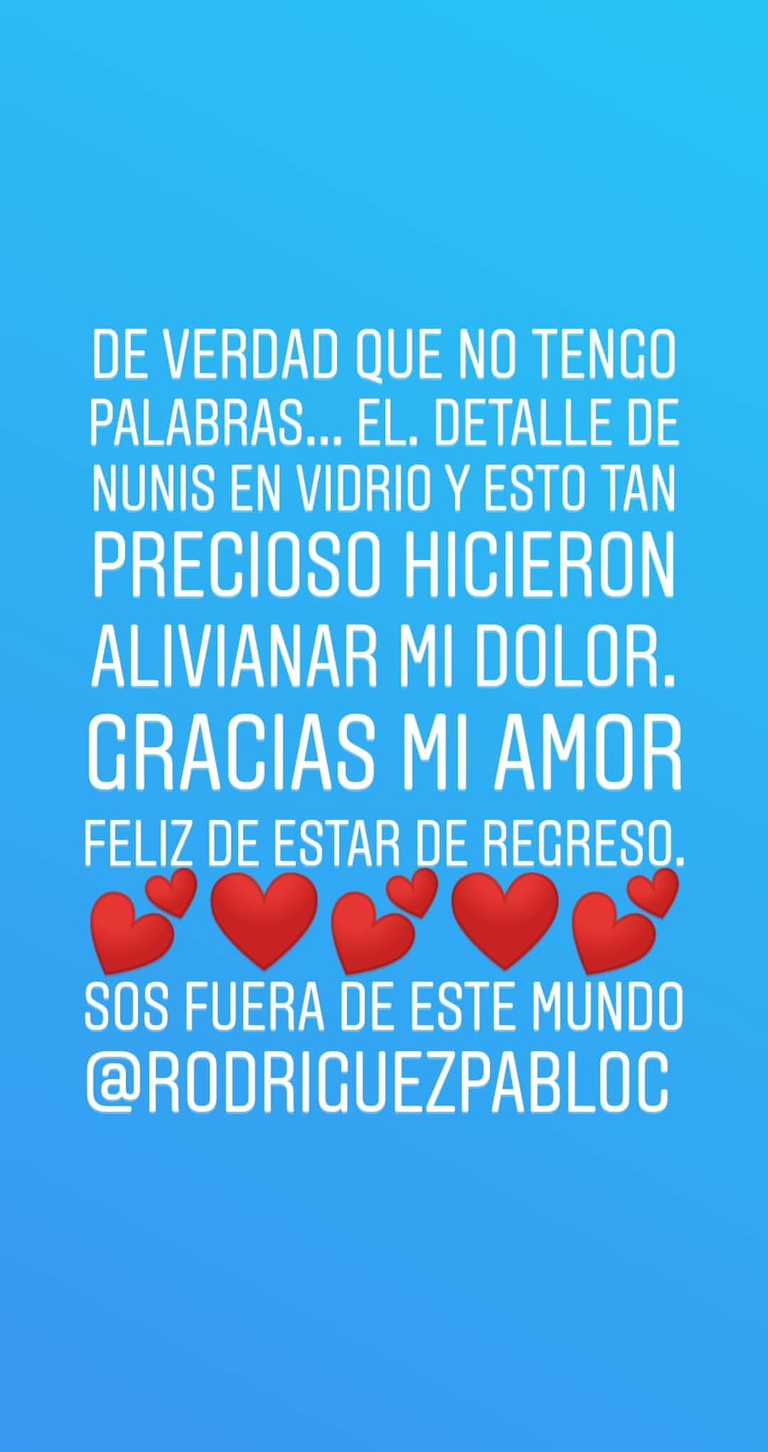 "De verdad que no tengo palabras. El detalle de Nunis en vidrio y esto tan precioso (las rosas) hicieron alivianar mi dolor. Gracias mi amor. Feliz de estar de Regreso. Sos fuera de este mundo", dijo Calderón.