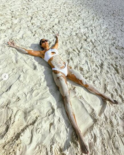 La guapa compartió las imágenes en un vestido de baño blanco, tirada en la arena y disfrutando del solcito.