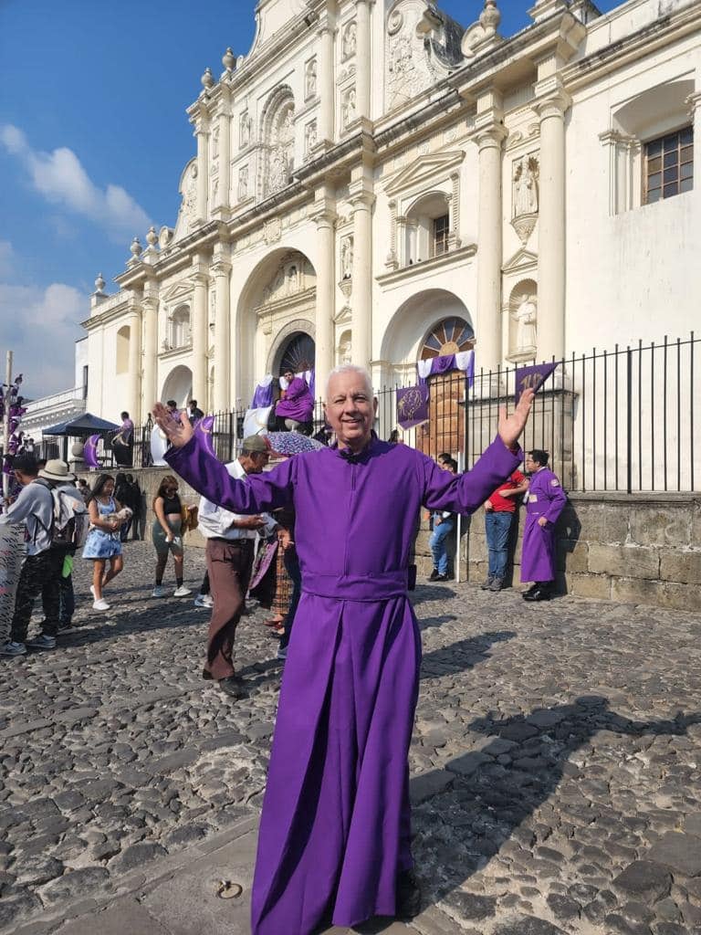 Es por eso que no puso peros a la hora de vestirse de “Cucurucho”, en Guatemala, el cual es un traje morado, similar a las túnicas que usan muchos padrecitos.
