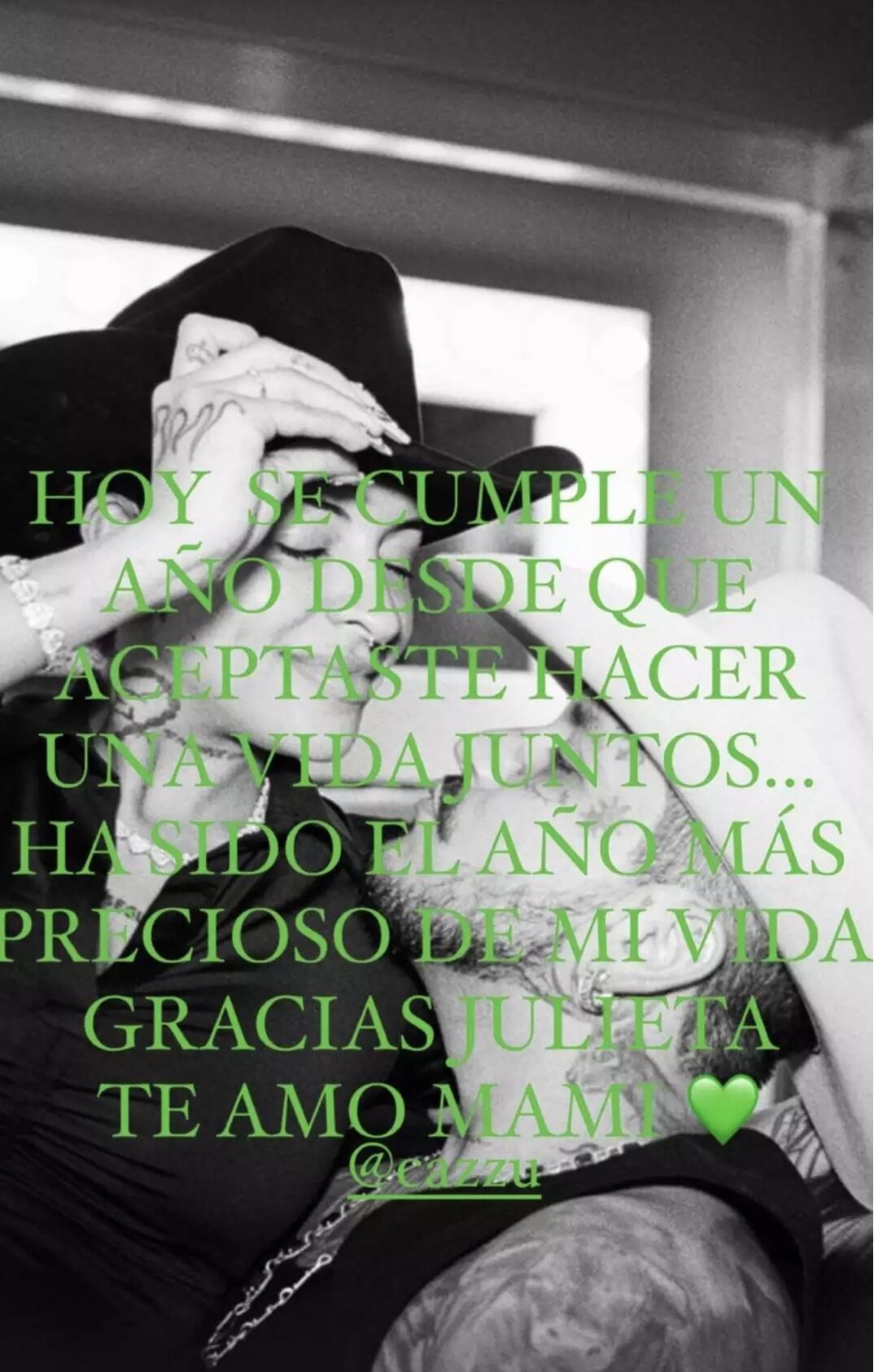 “Hoy se cumple un año desde que aceptaste hacer una vida juntos”, escribió el intérprete de Botella tras botella, en una historia de la misma red social. “Ha sido el año más precioso de mi vida. Gracias, Julieta. Te amo, mami Cazzu”.