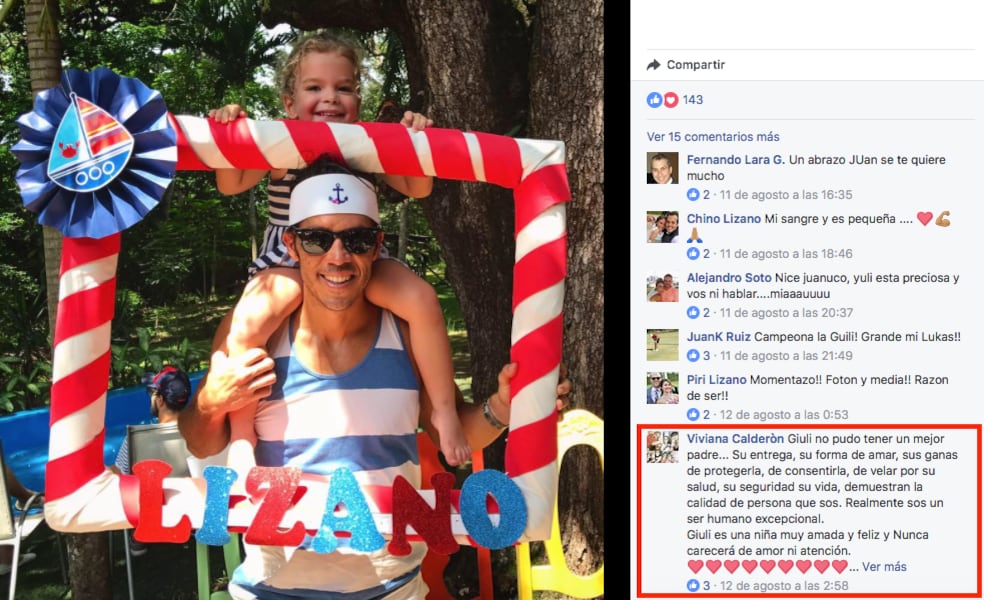 Calderón comentó una foto que publicó su esposo, Juan Lizano, en el perfil personal de él en la red social, en la cual aparece acompañado por la hija de ambos.