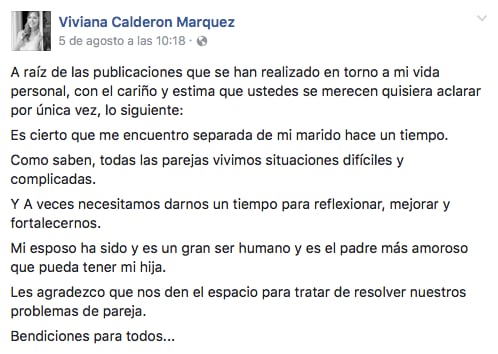El pasado 5 de agosto, Calderón confirmó la separación de su marido mediante una publicación en su página de Facebook.
