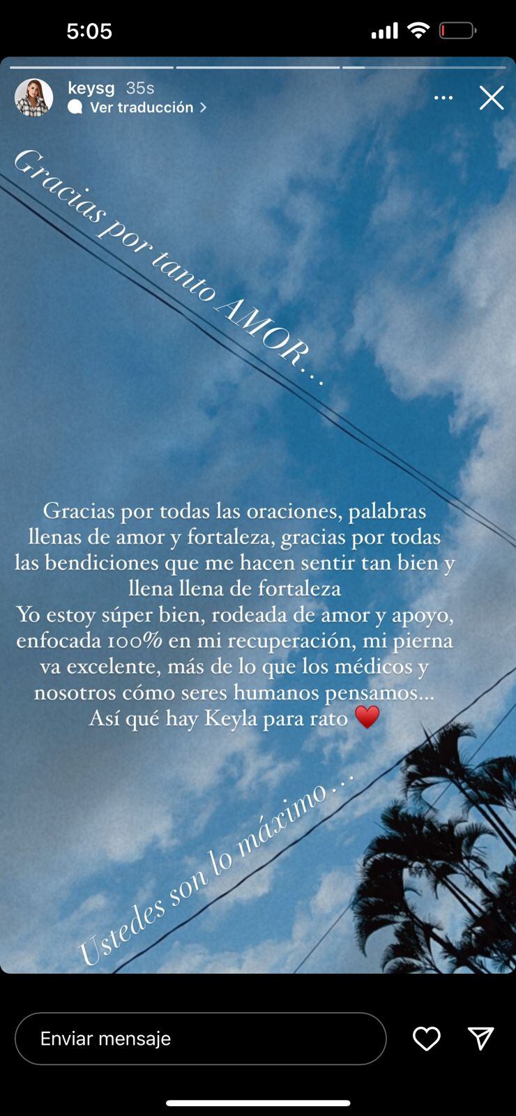 Yo estoy superbién, rodeada de amor y apoyo, enfocada 100 por ciento en mi recuperación, mi pierna va excelente, más de lo que los médicos y nosotros como seres humanos pensamos... Así que hay Keyla para rato”, escribió.