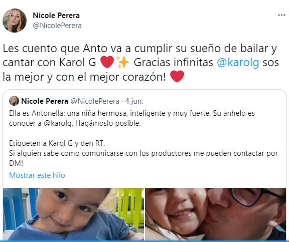 Fue así como ideó contar la historia de Antonella en Twitter y, además de etiquetar a la intérprete de “Tusa”, les pidió a varios conocidos que replicaran su mensaje para tratar de hacerle realidad el sueño a su sobrinita.