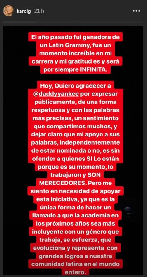 “A pesar de estar nominado, no estoy de acuerdo con la manera en que trataron al género y a mucho de mis colegas. Recuerden una cosa muy importante, su plataforma no fue la que creó este movimiento. Esto va más allá de un premio. Esto es cultura, credibilidad, pertinencia y RESPETO”, escribió Daddy Yankee en su Instagram. Dicho comentario tiene más de un millón de “me gusta”.