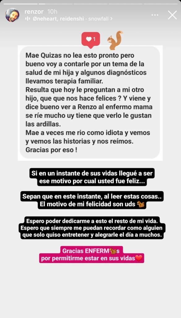 “Si en un instante de sus vidas llegué a ser ese motivo por el cual fue feliz, sepan que en este instante, al leer estas cosas, el motivo de mi felicidad son ustedes”, escribió Renzo.