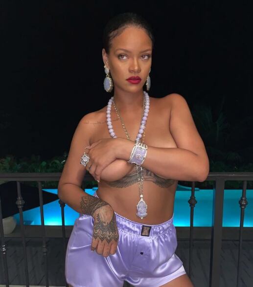 Rihanna aparece en la imagen solo con un short, un par de grandes aretes y el largo collar con la figura de Ganesha, todo combinado en color morado, mientras mira a un lado de la cámara.