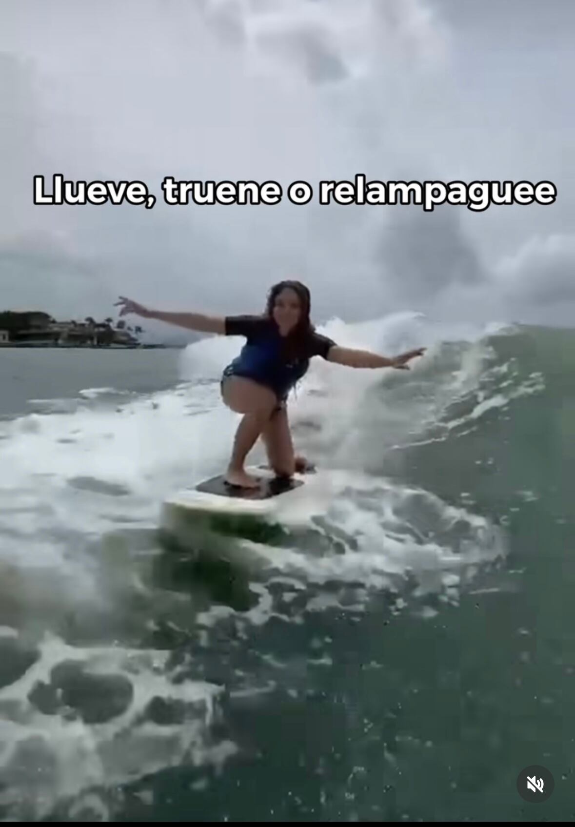 La cafetera compartió un video en su cuenta de Instagram donde sale surfeando, en dicho video se pueden observar las pésimas condiciones del clima, pero a pesar de eso la intérprete de “Acróstico”, no deja de hacer lo que más le gusta, poner a prueba su habilidad surfeando.