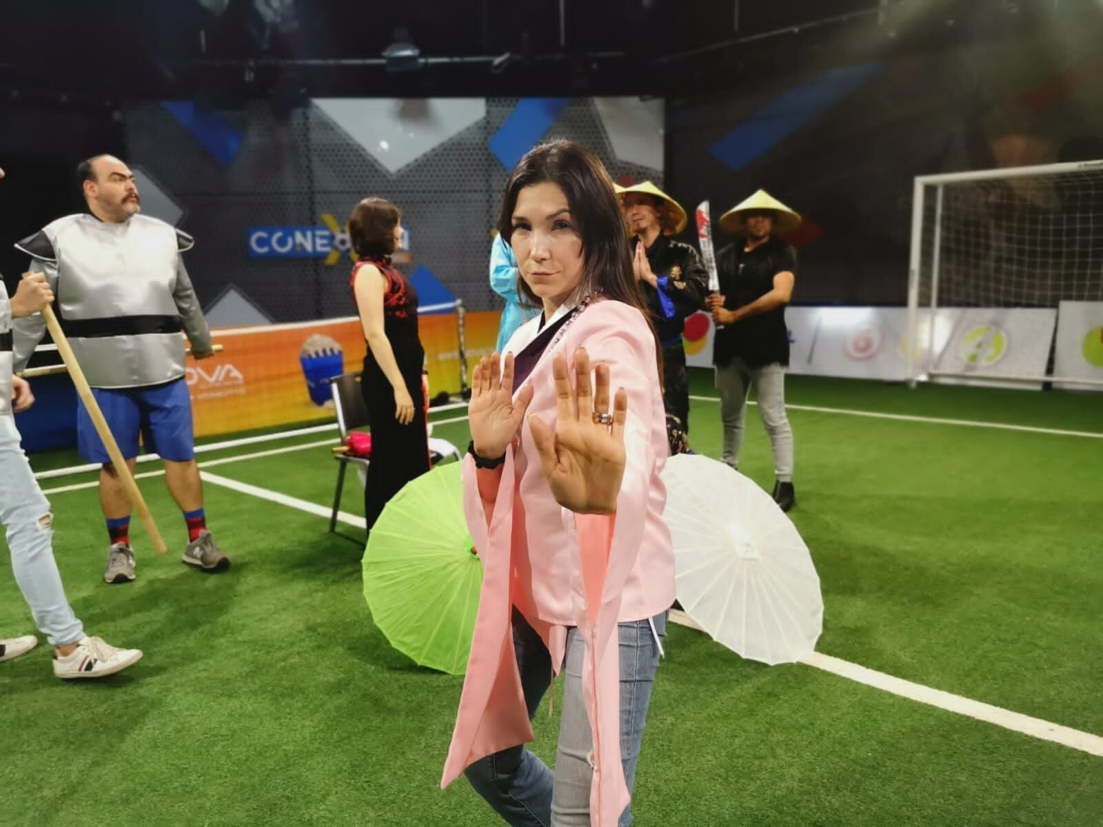 La presentadora de Informe 11 y el resto del elenco de La Matraca llevaron clases de esta arte marcial para hacer más creíble su participación de este sábado a las 8:00 p.m. por canal 6, en donde harán el musical de la película Mulán.