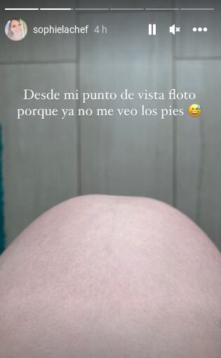 Y es que no es para menos, Sophi compartió este viernes una fotografía de la gran panzototota que tiene y que incluso, desde su perspectiva, ya no la deja verse los pies.