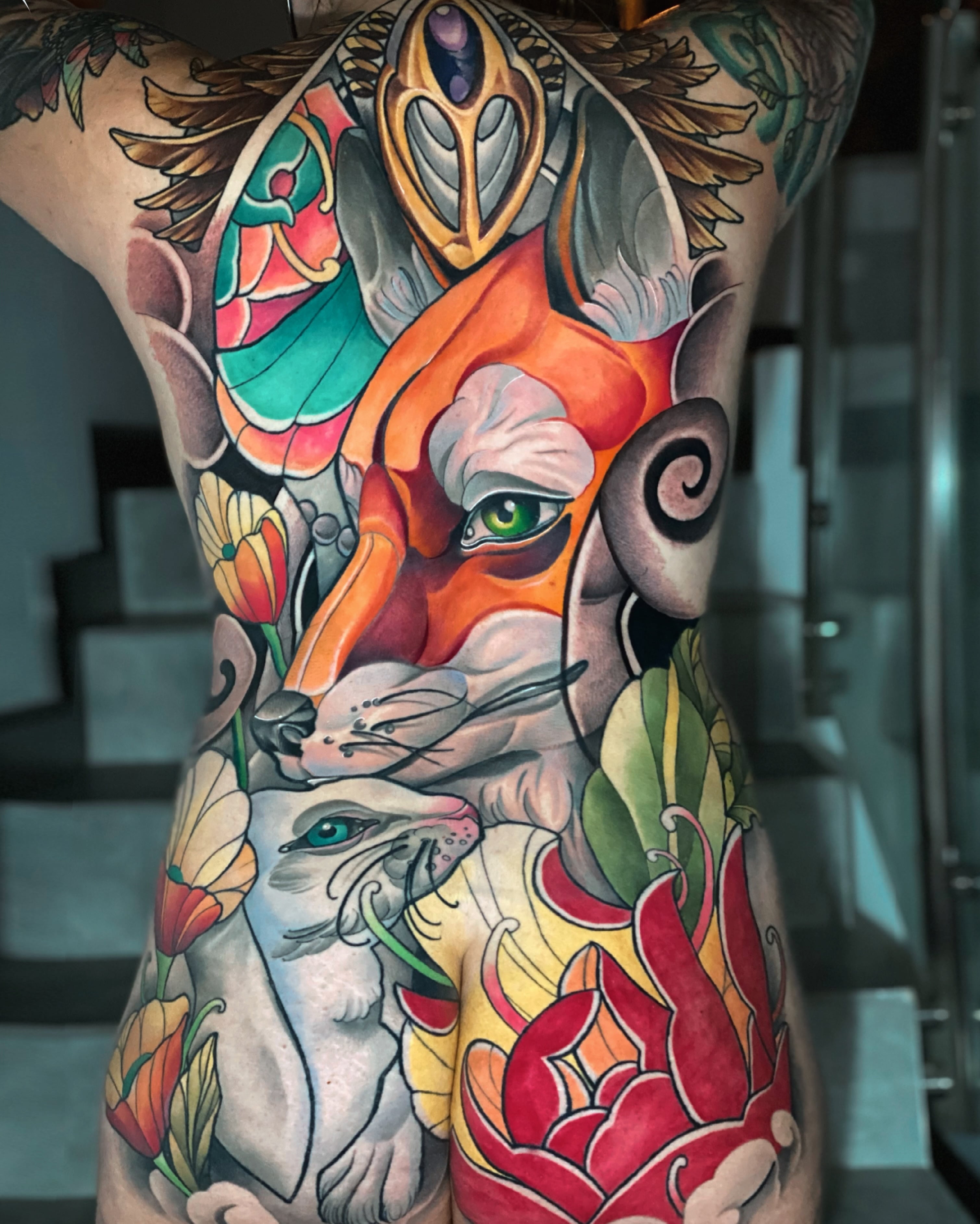 Hay cosas chiquititas que he hecho y que las veo muy limpias, casi perfectas y que tal vez uno las sube y no tienen tanto impacto, pero hay un tatuaje específico que me llenó muchísimo, porque fui de las primeras personas en completar una espalda, incluyendo las nalgas. Es una pieza muy grande, con un zorrito y un conejo, fue una breteada de locos, de hecho es un tatuaje que quiero mandar a competir porque me llena de orgullo.