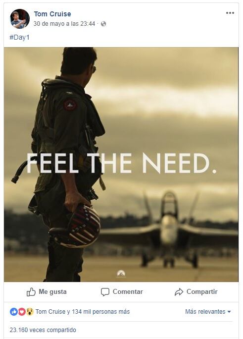 Bajo el hashtag "Day1", el actor tuiteó este viernes una foto del primer día de rodaje de "Top Gun: Maverick", la continuación de la película del año 1986.