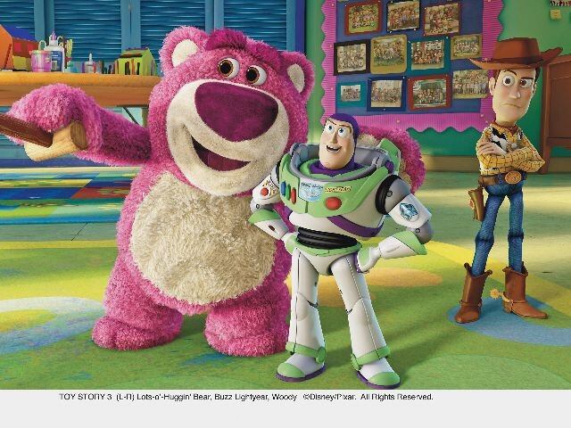 Lotso: Es un oso de peluche rosado, jefe de la guardería. Mantenía a los juguetes como prisioneros para evitar el escape de Woody y sus amigos.